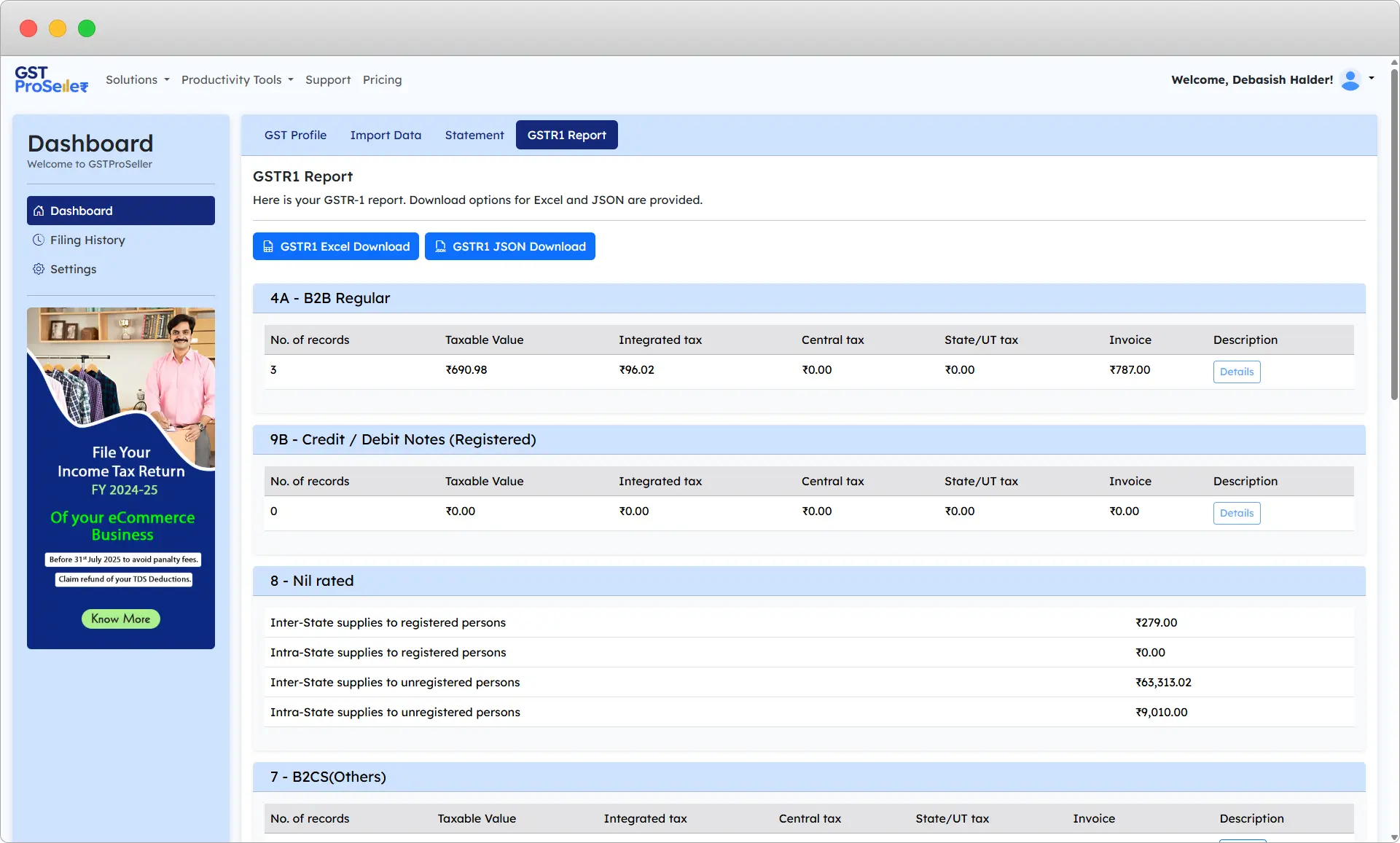Download the GSTR-1 Excel and JSON files, then upload them to the GST portal.